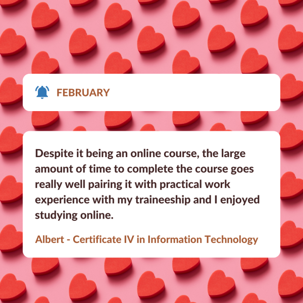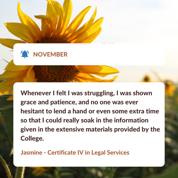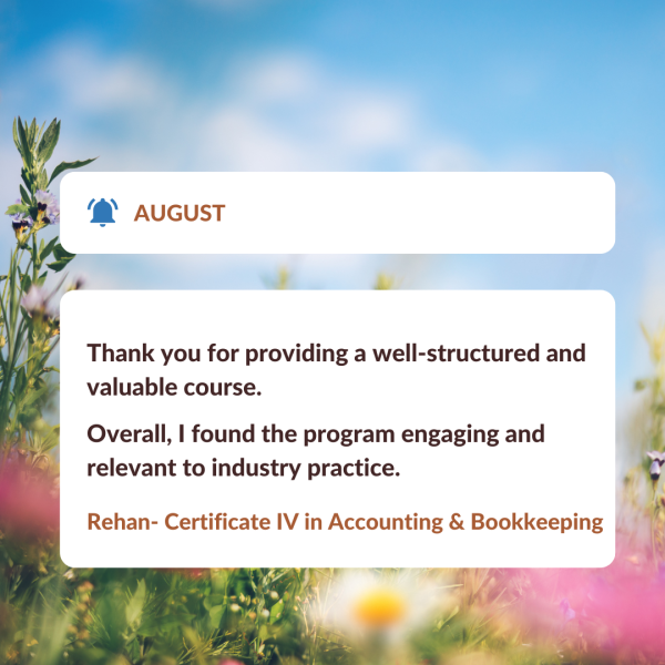 "I have truly enjoyed my learning experience throughout my Certificate IV in Bookkeeping and Accounting course with your college. The course was flexible, online and self-paced which meant that I could finish it in my own time and space and combine it with my full-time job. The course content was relevant, up-to-date and easy to access and understand. The structure for assessments and assignments was organised and easy to follow. My student adviser Donna was always helpful and supportive and the whole journey felt so pleasant, I would definitely recommend you to others!"