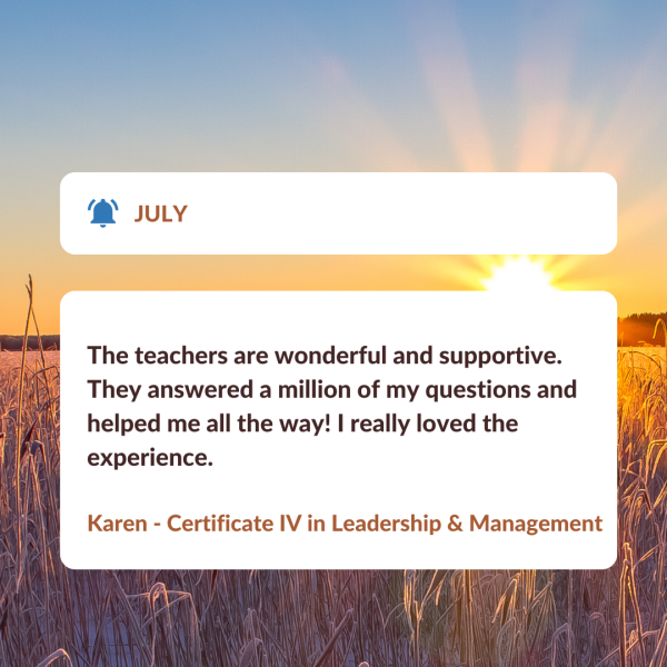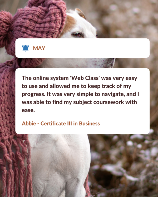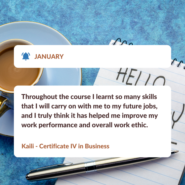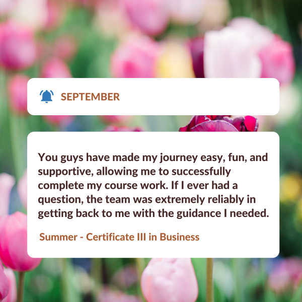 Thanks so much for your assistance in helping me complete my Cert III in business! This course was extremely insightful and offered all the tools I needed to confidently navigate the website and modules. Anytime I felt myself lacking in motivation or knowledge it was encouraging to know I had a fantastic team to help only a call away. I enjoyed the role play situations where I was able to learn in a controlled environment, I strongly believe I will use areas of each topic in my future career and whilst while navigating everyday life. Thanks again for this great opportunity to learn and expand my horizons.