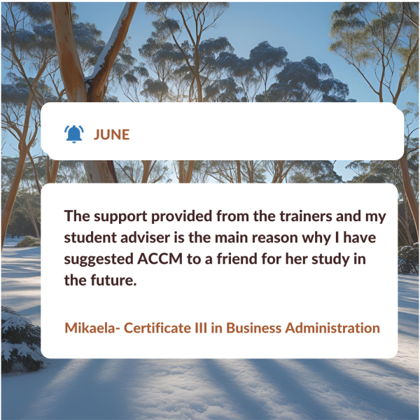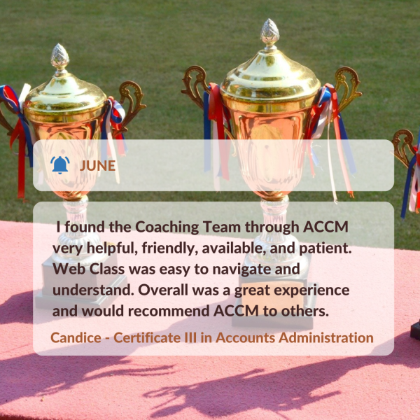 Overall, I really appreciated how much the college advisors helped me and how the content was laid out and easily displayed to help me understand the content and answer questions. Even though I have finished my Cert III, I am thrilled to be starting my next course Certificate IV in Accounting and Bookkeeping through ACCM as I know I will get all the help I need and also, I enjoyed last year so much, I know this year will be amazing as well!