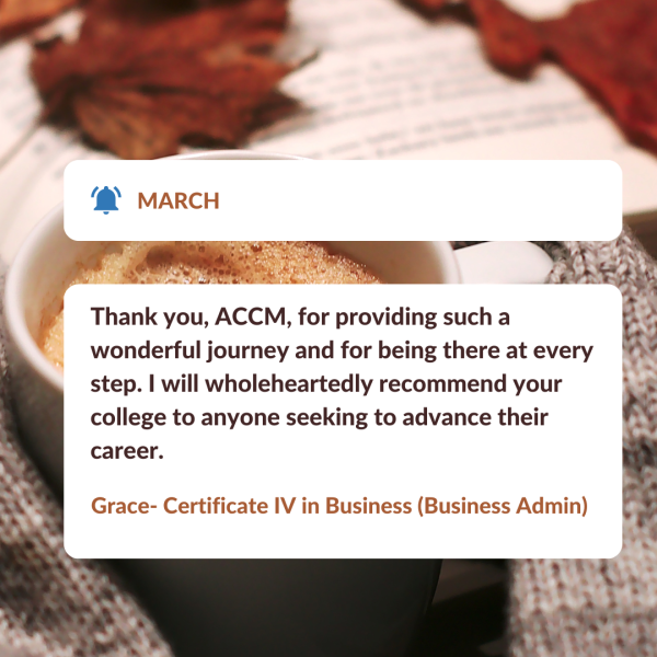 “I have had an amazing experience completing my Certificate IV in Accounting & Bookkeeping with ACCM! My supervisor Donna provided amazing support and when she wasn’t available for my query; there were other teachers available to assist me- always happy to help me understand my subjects and the task at hand. I will be keeping ACCM at the top of my list if I am looking to further my education down the track for sure. Thank you to all at ACCM!”
