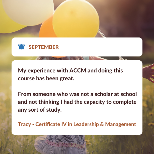 Below is a review of my experience for my Cert IV in Leadership and Management. I had a really positive experience completing my course with ACCM. The content was practical and well-structured, and I gained skills I can apply directly in my role. I’d especially like to thank Kerri Hampton for her ongoing support and guidance, which made a big difference throughout my studies.
